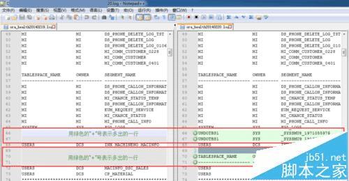 6、这时,整个Notepad++的布局发生了变化,形成了一种左右对比的布局,并且有些行还有不同的背景颜色和小图标,这些都代表着两个文本内容的不同之处,黄色"!"叹号表示有部分内容不同,绿色“+”号表示多出来的行,红色”-“表示少出来的行,如图所示: