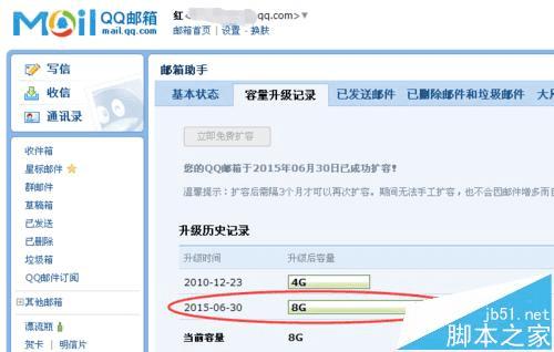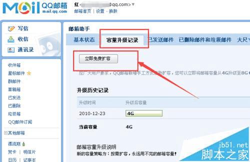 2、进入邮箱助手后,在菜单选项卡上选择【容量升级记录】,并点击【立即免费扩容】。