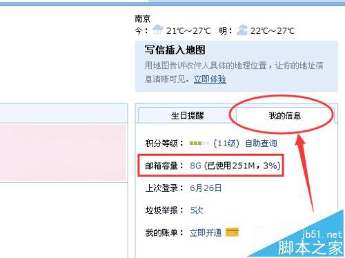 6、查看邮箱容量是否足够:进入邮箱首页的时候,在右侧找到【我的信息】,点击开来就能看到邮箱的利用率了。利用率到50%以上,就需要进行清理或者是免费扩容了。