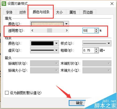 6、在弹出的“设置对象格式”对话窗口中,切换选项卡到“颜色与线条”选项,将填充下的“透明度(T)”设置为50%。然后再点击“确定”。如图所示;