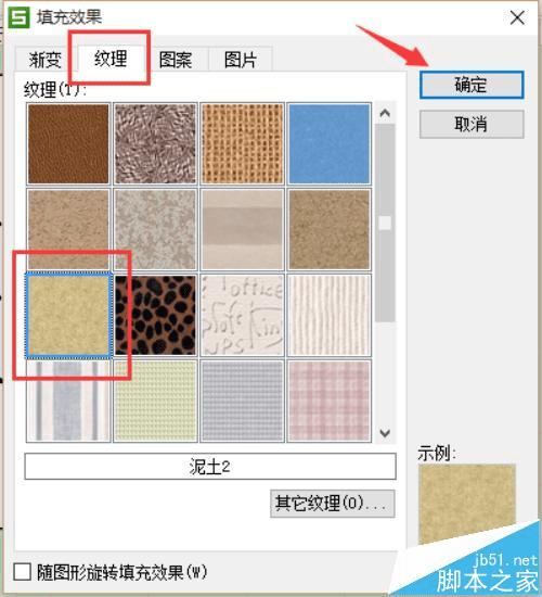 4、在弹出的“填充效果”对话窗口中,切换到“纹理”选项卡,在纹理(T)选项窗口中选择我们需要的纹理效果,这里我们选择的是“泥土2”纹理效果。然后再点击“确定”。如图所示