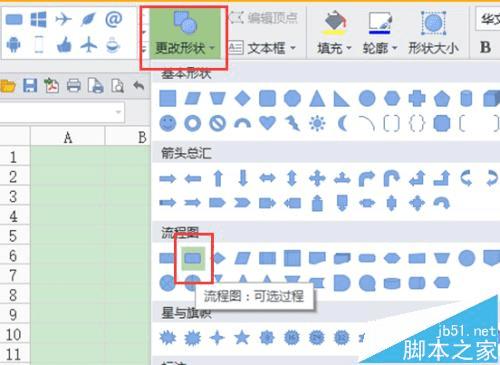 8、边框设置好后,还需对文本框的形状进行调整。点击“绘制工具”菜单选项,再点击绘制工具选项栏下的“更改形状”选项,在弹出的形状选项框中选择我们需要的形状(这里我们选择的流程图中的“流程图、可选过程”形状)。如图所示