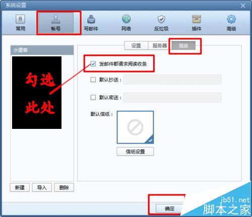 6、在“高级”下方的设置选项中,找到“发邮件都请求阅读收条”,并勾选后点击确定,即可设置发邮件请求阅读收条,如下图所示: