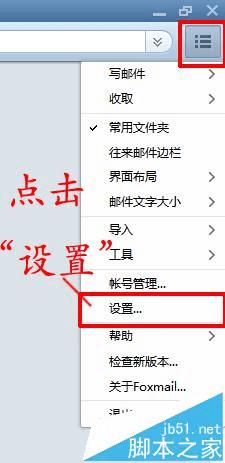 2、点击写邮件界面右上角图下图所示图标,在下拉菜单中,找到“设置”,并选中,如下图所示: