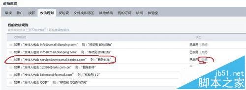 3、在“收件规则”页面中找到【如果:"发件人包含 12306@rails.com.cn" 则:"删除邮件"】规则后,点击“关闭”。