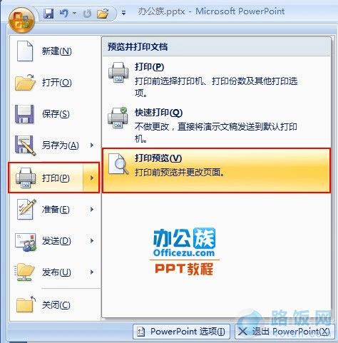 4、 返回PowerPoint2007编辑框,点击左上角的“Office按钮”。选择“打印”功能栏中的“打印预览”选项。