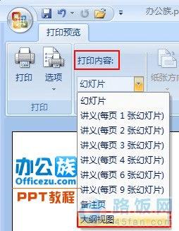 5、 进入打印预览功能后,在“打印内容”中选择“大纲视图”。