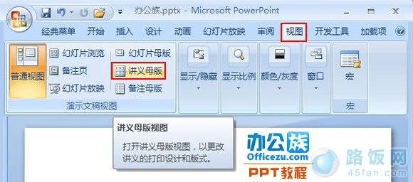 1、 打开PowerPoint2007,点击“视图”功能栏,在“样式文稿视图”选项组中选择“讲义母版”。