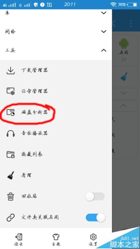 1、打开ES文件浏览器>>点击左上角>>工具>>磁盘分析器