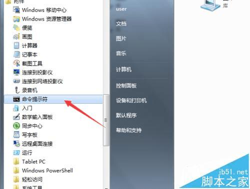 2、然后打开我的电脑中所有程序,并在列表的找到附件的选项,在附件找到”命令提示符“,选项命令右键。或者直接使用快捷键win+R