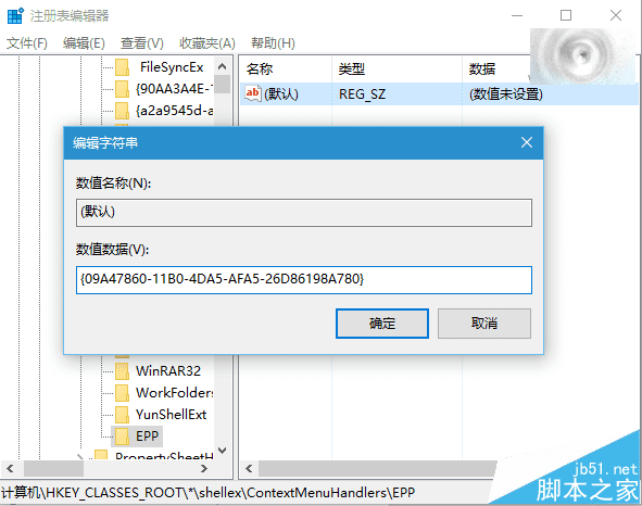 若想恢复该项目,可以重建上述两个项,并且把默认字符串值设为{09A47860-11B0-4DA5-AFA5-26D86198A780}即可(如上图)。