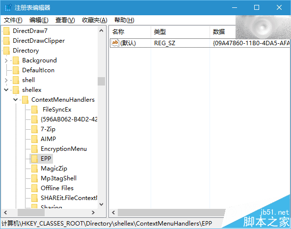 4、定位到(如下图):HKEY_CLASSES_ROOT\Directory\shellex\ContextMenuHandlers\EPP删除