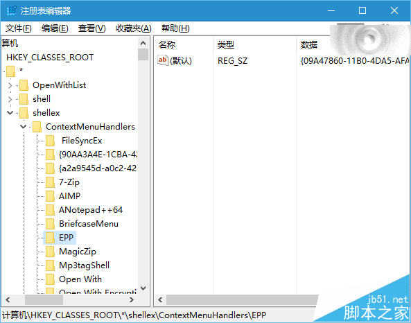 2、定位到(如下图):HKEY_CLASSES_ROOT\*\shellex\ContextMenuHandlers\EPP删除