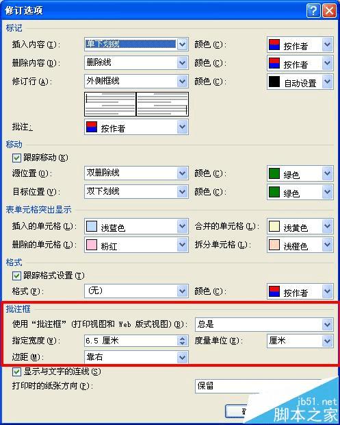 3、在弹出的“修订选项”设置框中,找到“批注框”,如下图所示: