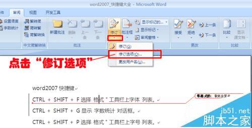 2、点击工具栏中“审阅”找到“修订”,在修订工具下方找到小箭头,并点击,出现下拉菜单,选择“修订选项”,如下图所示: