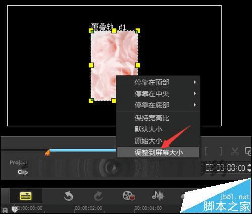 4、在覆叠轨上面进行操作。把素材拉入覆叠轨上面。选中覆叠轨上面的图片素材。在窗口的界面中在图片上面点击右键,在列表中选择高速到屏幕大校