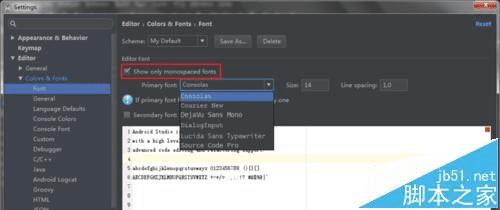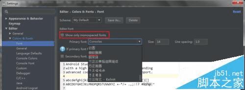 1、首先在菜单栏找到File菜单,然后File>Settings>Editor>Colors & Fonts>Font,准备修改字体。不幸的是,Android Studio自带的Scheme是不允许修改字体的,如下图所示。