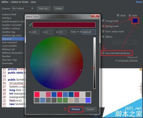 7、在修改颜色前,首先确保不勾选“Use inherited atrributes”,再点击颜色框,最后在弹出的颜色选择对话框中选择自己期望的颜色,点击choose选择。