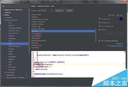 6、那么,Colors & Fonts>Java,点击要修改颜色的代码字段,则对应的代码字段类型将被选择,如代码字段“interface”对应“keyword”类型,右边即是对“keyword”类型字段的指定设置。