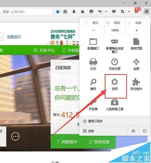 2、我们可以先尝试清楚浏览器的COOKIE试一下,我们点击火狐浏览器右上角的设置,然后点击里面的“选项”。