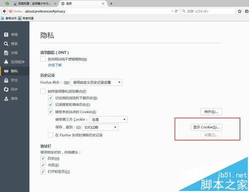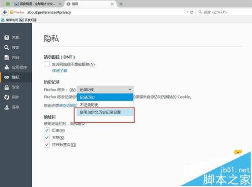 3、然后依次找到“隐私”以及“历史纪录”下面的“使用自定义历史记录设置”
