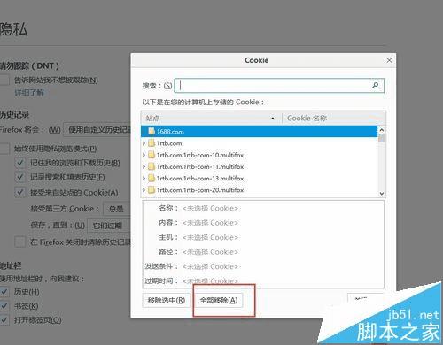 4、然后继续点击“显示cookie”,然后继续点击“全部移除”。