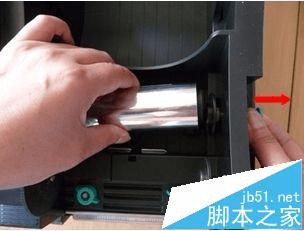 6、取出另一个色带芯轴和碳带卷轴,依照图中指示,将色带芯轴插入色带卷轴中