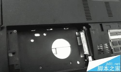 3、然后,将左侧的电脑硬盘取下来。在那个白色固定架上有螺丝,注意先拧下来。然后固定架的左侧有一个白色的塑料片,用手捏往左上方,轻轻的拽它,角度不要太高,以防把硬盘接口拽坏。
