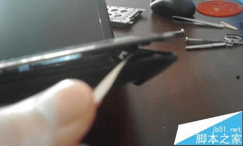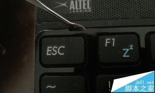 6、从图上,我们可以看到,在键盘的四周每隔一段都会有一个小缺口,我们用掏耳朵勺轻轻的撬开它们。先撬开键盘最上面的一行。然后再撬两侧。