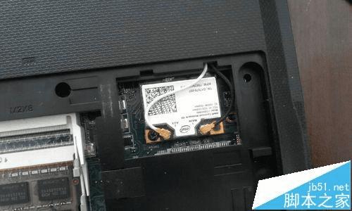 4、然后,将右侧的无线网卡拆卸下来。拆时,用掏耳勺轻轻的将线向上挑起,注意黑线和白线的顺序,安装的时候不要弄混了。