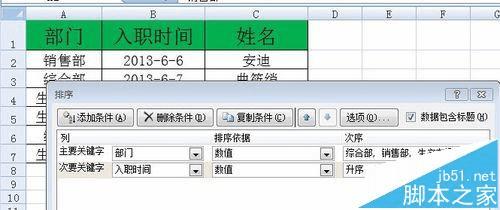 1、数据表格如图中所示,各部门按照综合部、销售部、生产车间的顺序排序,部门内按照入职时间的先后顺序排序。
