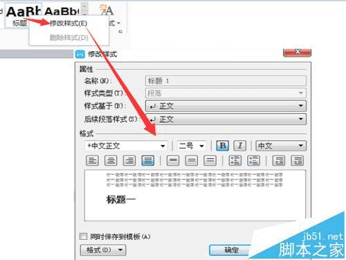 3、工具栏上的标题规范是有默认字体和大小的,如果想要自己设置标题字体和大小。如图,可以把鼠标放到标题规范上,点击右键,选择修改样式,在弹出的窗口中进行修改就可以了。