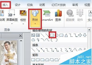 3、但是我们要是修改一下插入图片的方法,即可达到要求,首先点击菜单栏中的插入——形状,选择矩形