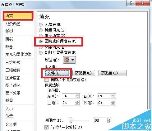 5、在设置形状格式中,选择填充中的图片和纹理填充,选择文件,找到自己需要的图片,插入
