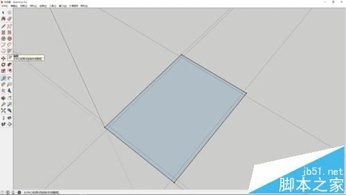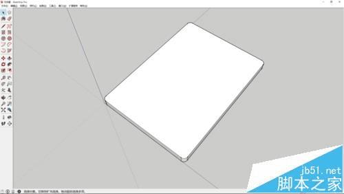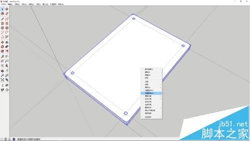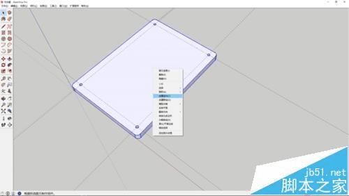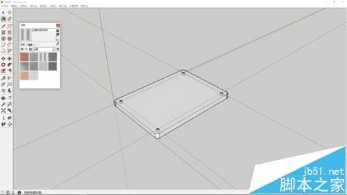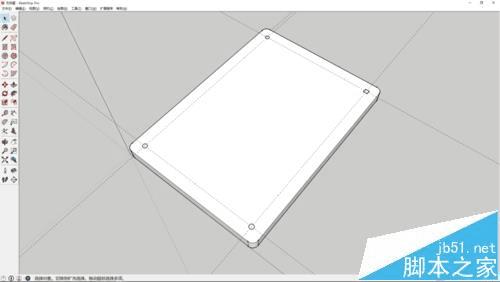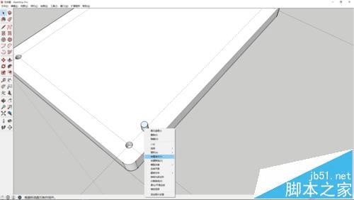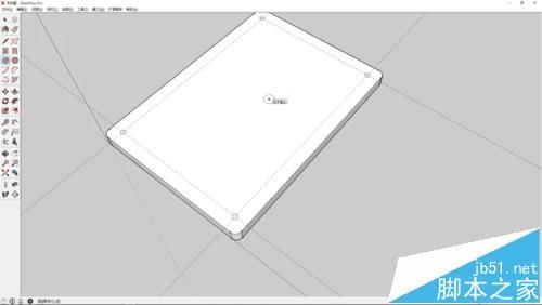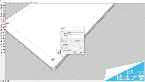 3、使用卷尺工具从四条边拉出四条距离边线10mm的参考线,以交点处为圆心绘制4个半径2mm的圆,并使用推拉工具将四个圆面向下推拉5mm。