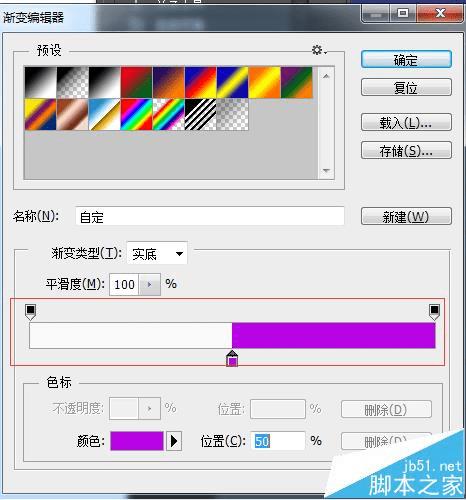 5、如图所示设置“渐变编缉器”里颜色的色块位置和选择颜色,然后按“确定”后文字就成为双色的了,但由于背景是白色,文字下半部分还看不大清楚。
