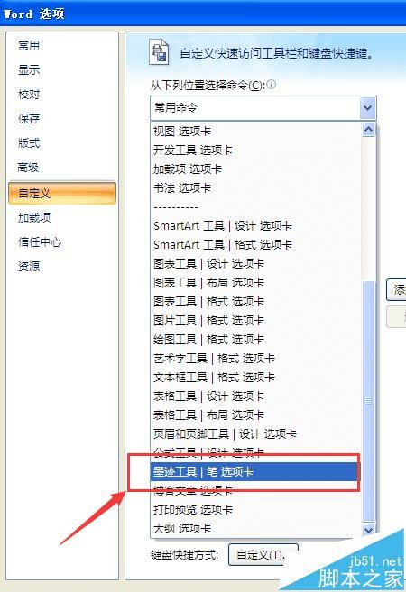 3、将“常用命令”选项改成“墨迹工具|笔 选项卡”