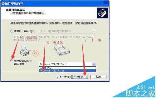 4、在接下来的步骤中,我们选择“创建新端口”;再选择“Standard TCP/IP Port”项即可;单击“下一步”按钮后弹出新的对话框,直接单击“下一步”按钮继续。