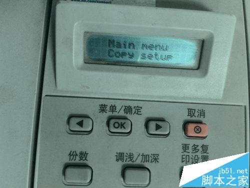 2、然后会出现“main menu copy setup”意思是复印设置,如图,这个时候再按面板“ok”键 进到下一个界面如图所示。copy setup def。light/dark 意思是复印设置,light颜色调清淡,dark 颜色加深