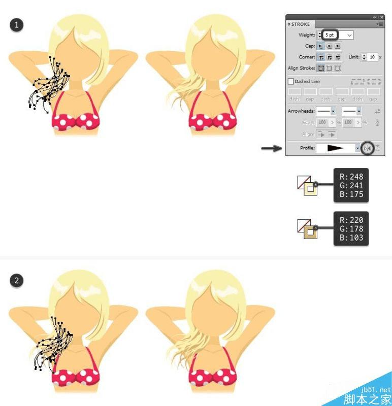 接下来开始创建马尾辫,使用画笔工具(N),绘制你想要的足够多的路径,面边面板中选择用配置文件四,确保笔触的尖端朝下,否则使用描边面板里的镜像工具,选择不同描边粗细的值,从2点到3点到5点,用两个描边颜色,来增加更丰富的效果,下图一。