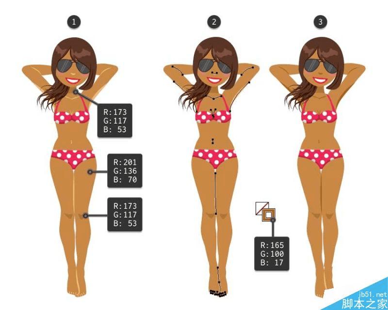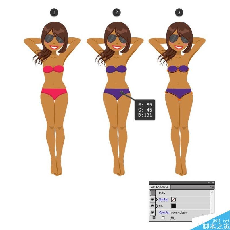 删除泳衣上的圆点。和所有的条纹,选择紫罗兰色作为比基尼的填充色,然后增加两个阴影的形状透明度从20%到50%,来让他们看起来更明显一点。