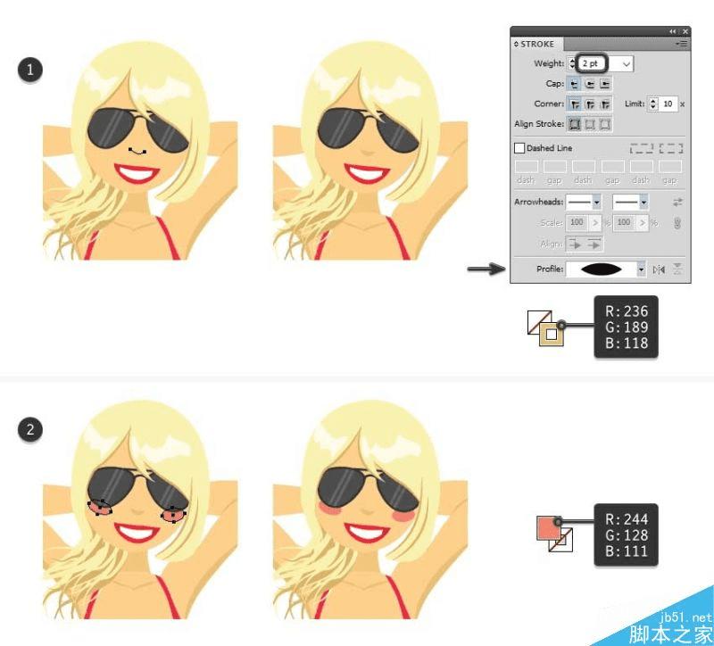 画一个简短的路径作为鼻子,给他两像素的描边,宽度配置文件一。对于枫红色脸颊,绘制两个椭圆填充粉红色,把他们放在太阳镜的后面。
