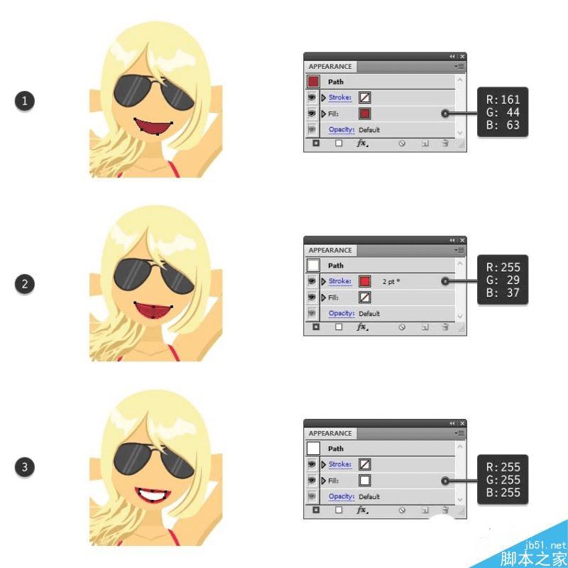 使用钢笔工具(P),绘制嘴部的形状,然后绘制上嘴唇和下嘴唇,给他们两像素红色描边,使用描边面板中描边类型一,最后画一个白色的形状作为牙齿。