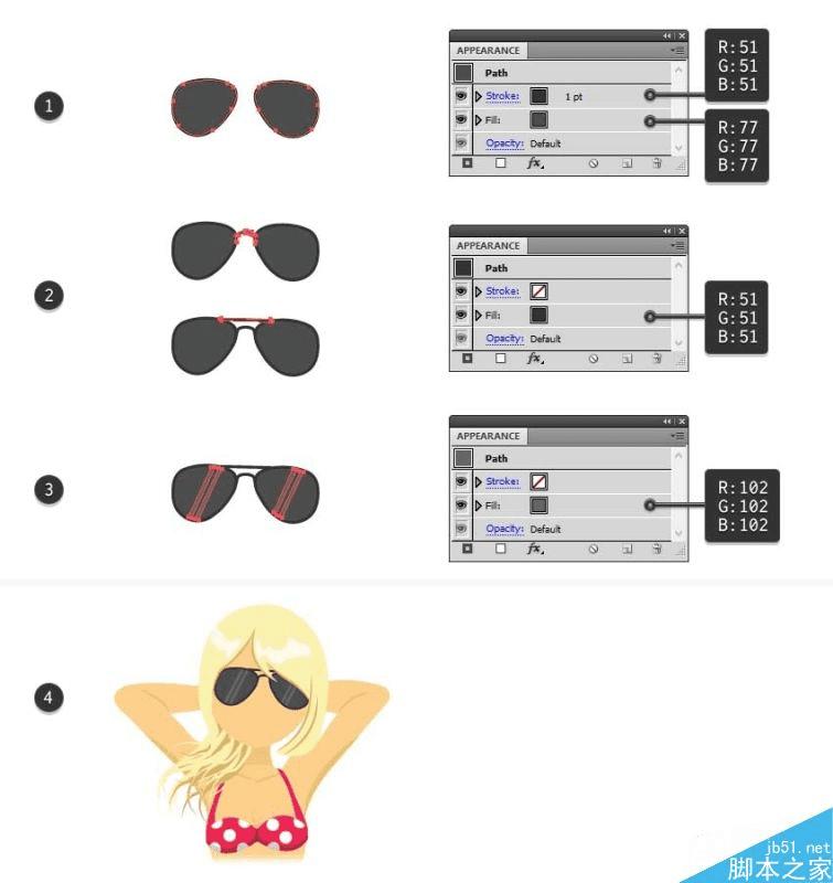 让我们开始创建太阳镜,首先绘制出眼睛片的形状,接下来选择一个灰色的填充,和深灰色的描边,接下来绘制两个眼睛片之间的桥梁连接部分,接下来制作四个细长的矩形来作为太阳镜的反光。