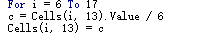 4、使用for循环,将i值循环赋予6to17,每次都将13列单元格值计算后写入原对应单元格中,使用的公式为人民币与美元的汇率6:1。