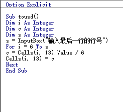 6、我们可以修改一下代码,新建一个变量s,并且使用inputbox函数来给s赋值,然后修改i循环为6tos。这样添加数据我们也能快速的获得答案了。