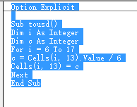 3、我们来阅读一下这段代码,首先是变量声明,建立过程,然后声明了2个变量i和c,其中i变量用来循环,c变量用来储存单元格原值并计算。