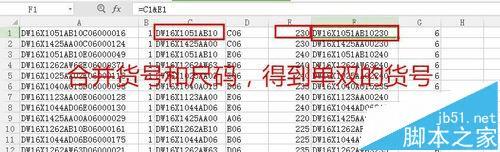 5、得到内装散鞋的货号。合并货号和尺码,得到箱子内装的散鞋的货号,合并第一步的单元格和第四步的单元格,输入=C1&E1,合并单元格。得到里面所装散码的货号。