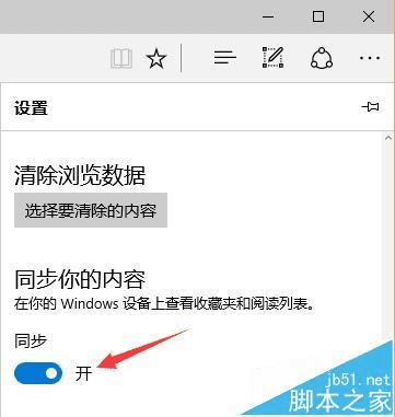 5、如果完成了登陆,那么同步Edge的书签就变得非常容易了。打开Edge,并选择【更多按钮】(在Edge工具栏最右边,见图中箭头),然后选择【设置】,将【同步】打开即可实现同步,同步是自动化的,所以用户完全不需要自己同步书签。