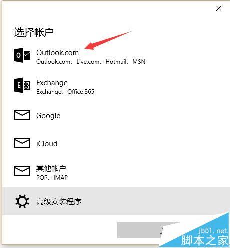 4、在选择界面选择【outlook.com】,然后按照要求输入【账号】和【密码】,点击登陆即可。